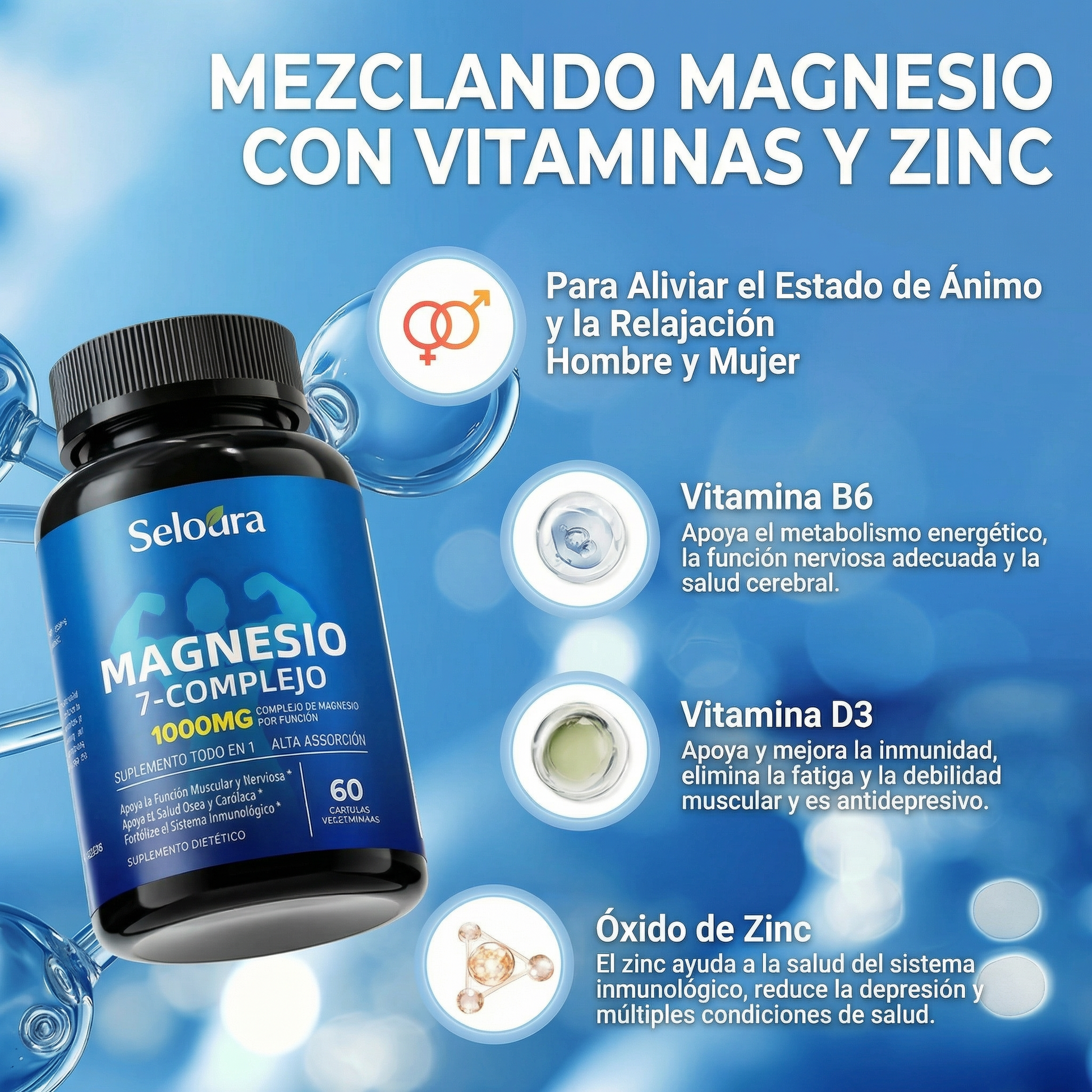 La mayoría de las marcas económicas usan Óxido de Magnesio, que es básicamente "polvo de roca" y tu cuerpo absorbe menos del 4%. Seloura utiliza 7 formas bioactivas (como Glicinato y Malato) que tu cuerpo reconoce y absorbe casi al 100%, asegurando que los nutrientes lleguen a donde realmente se necesitan.