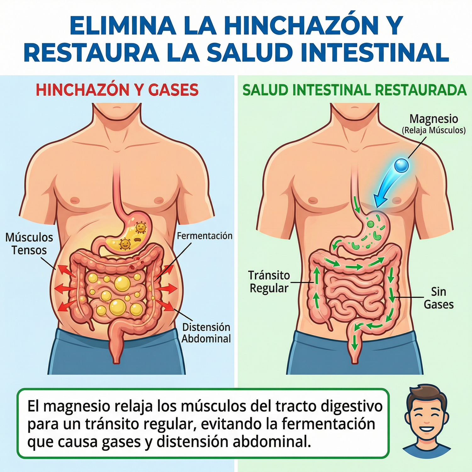 El magnesio relaja los músculos del tracto digestivo para un tránsito regular, evitando la fermentación que causa gases y distensión abdominal