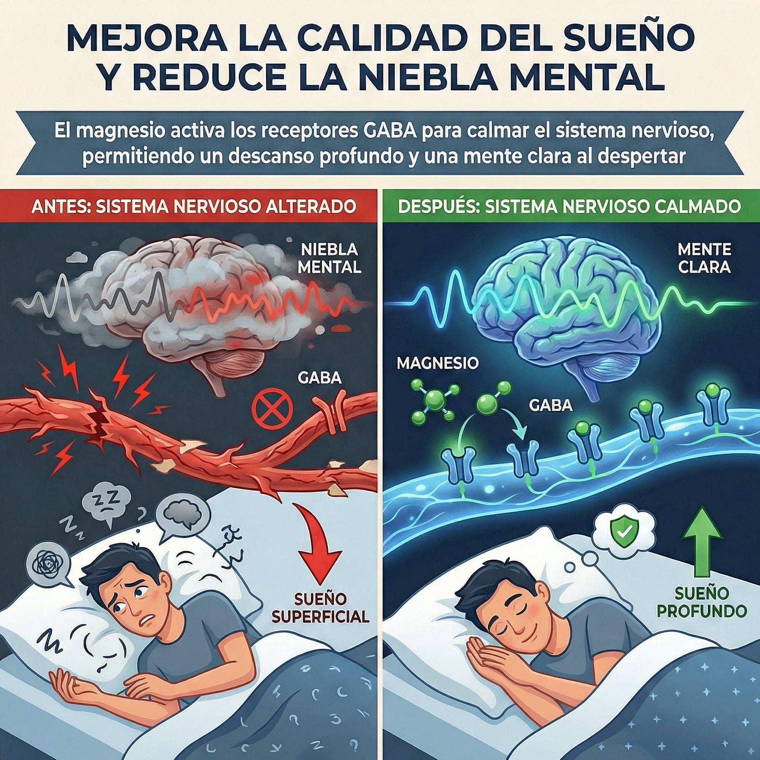 El magnesio activa los receptores GABA para calmar el sistema nervioso, permitiendo un descanso profundo y una mente clara al despertar
