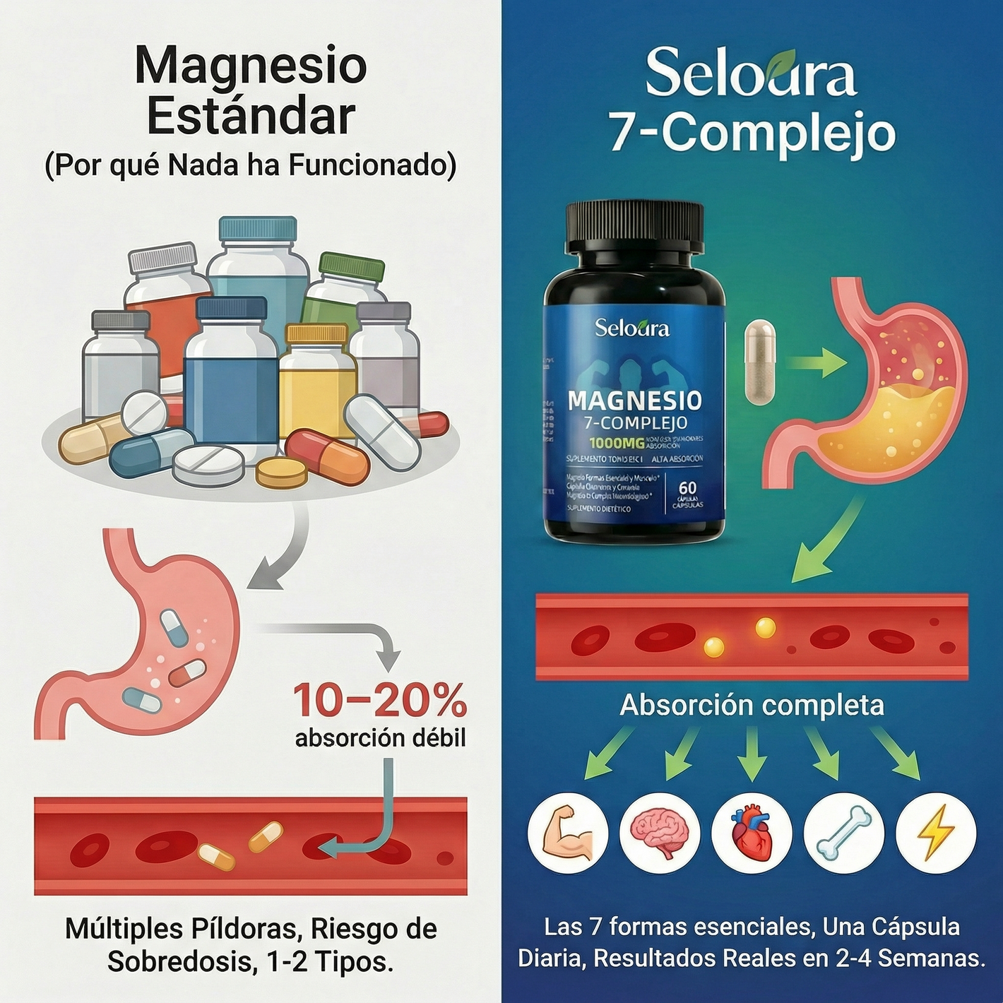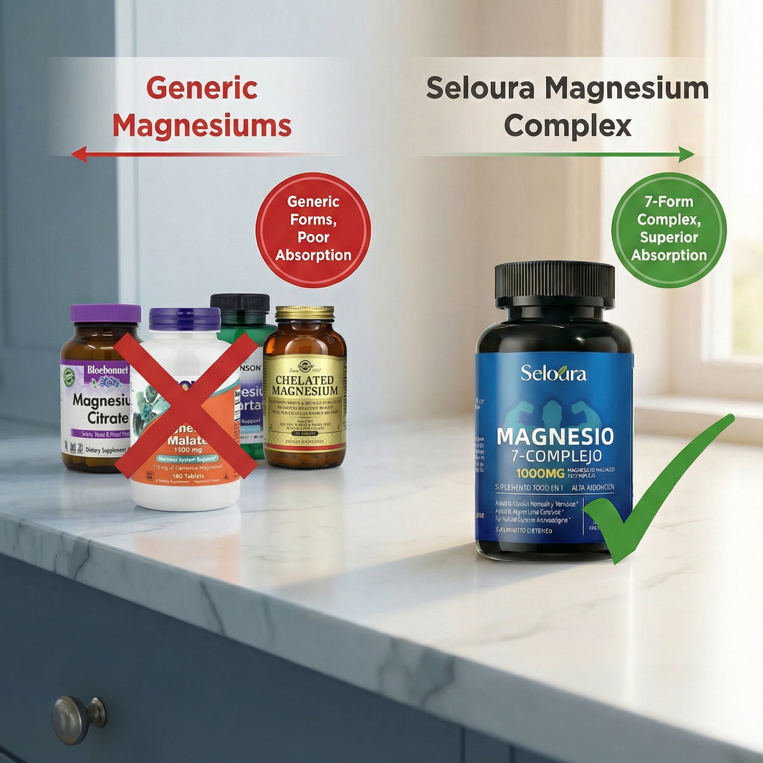 La mayoría de las marcas económicas usan Óxido de Magnesio, que es básicamente "polvo de roca" y tu cuerpo absorbe menos del 4%. Seloura utiliza 7 formas bioactivas (como Glicinato y Malato) que tu cuerpo reconoce y absorbe casi al 100%, asegurando que los nutrientes lleguen a donde realmente se necesitan.